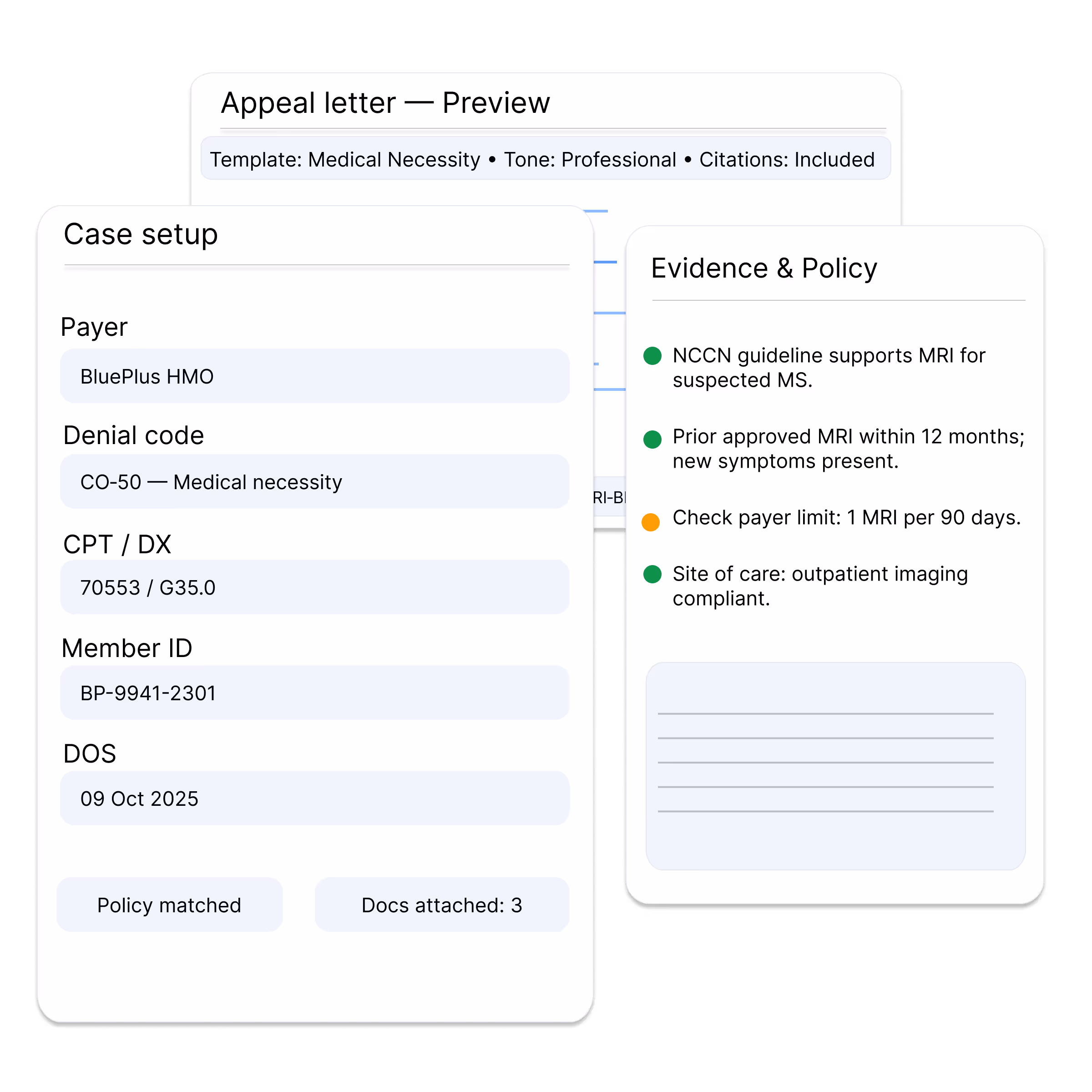 Instantly generate payer-specific, evidence-based appeal letters that align with clinical documentation and regulatory criteria, improving overturn rates while reducing manual burden.