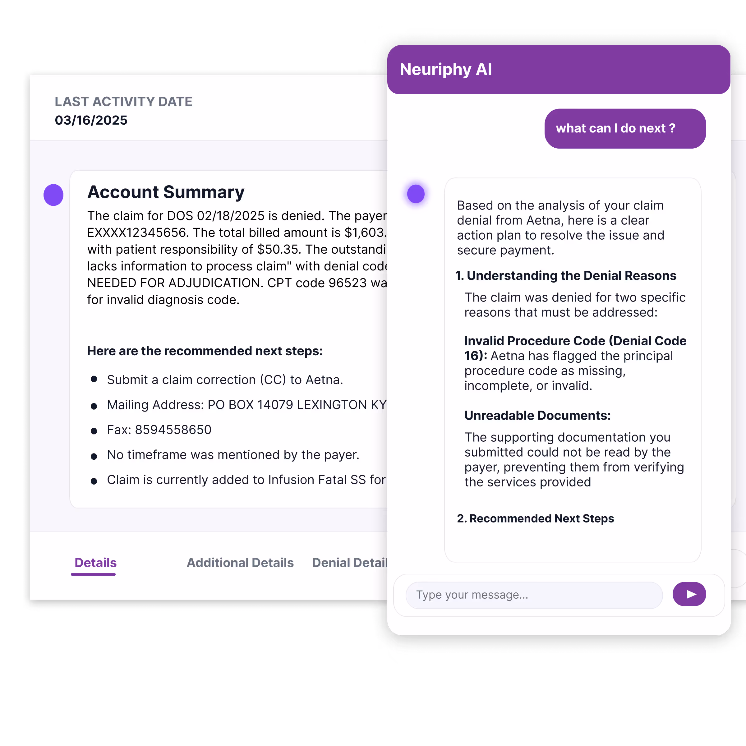 Neuriphy’s AI-powered denial management solution automates classification, prioritization, and appeals to cut A/R delays, reduce costs, and recover revenue faster.