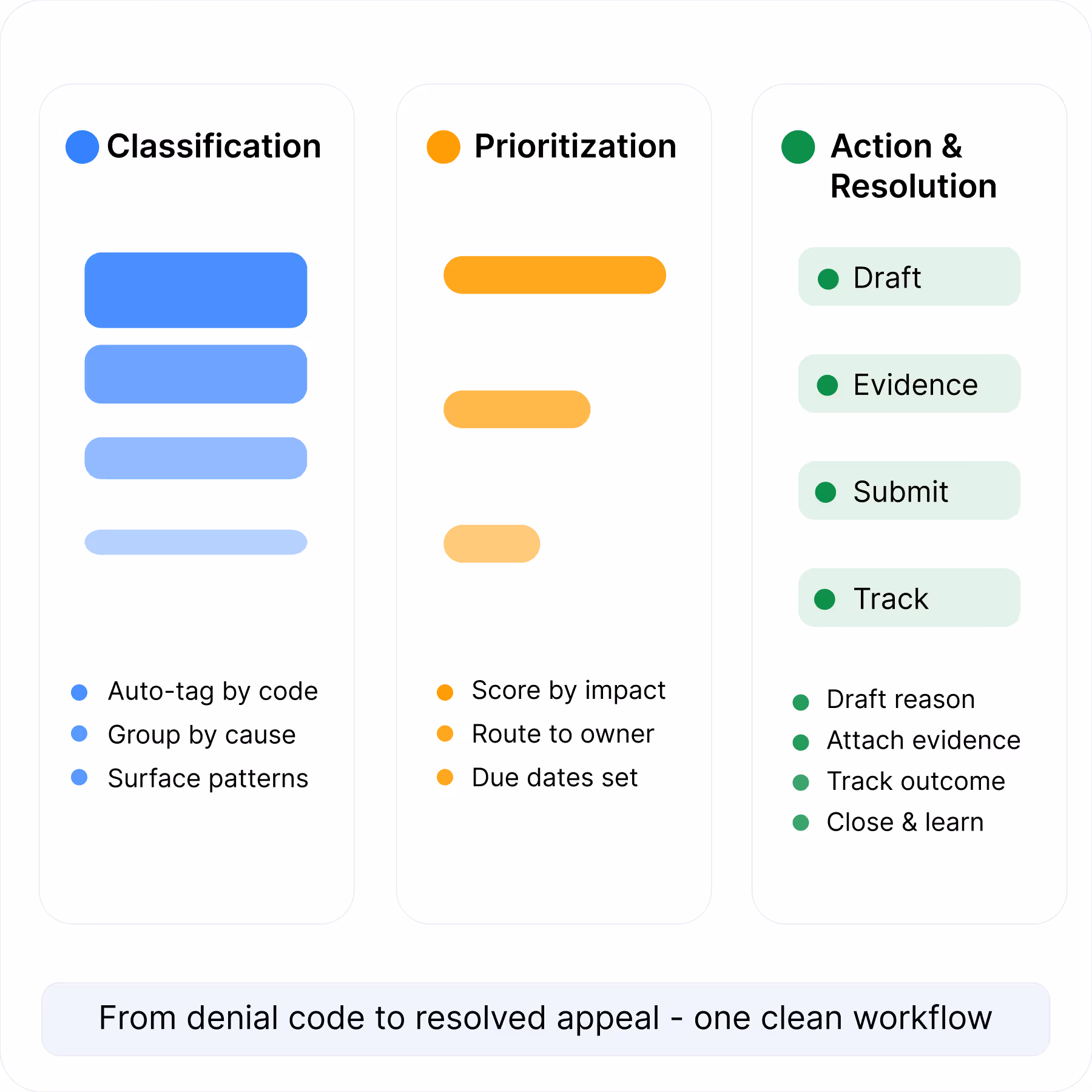 Faster Recovery: Focus staff time on high-value, winnable denials.