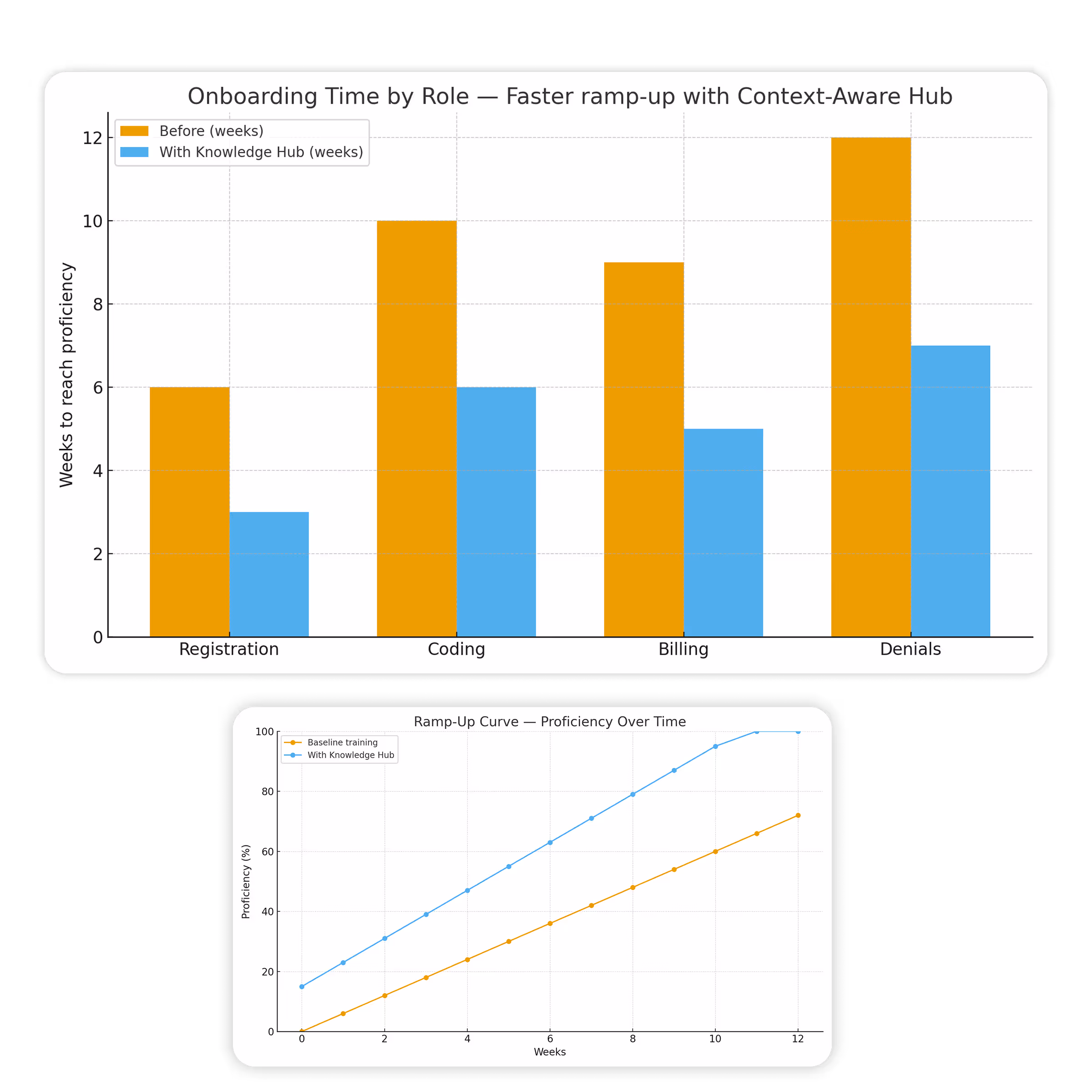 New staff onboard quickly by accessing both general revenue cycle knowledge and your organization’s unique processes in one AI-guided, interactive knowledge hub.