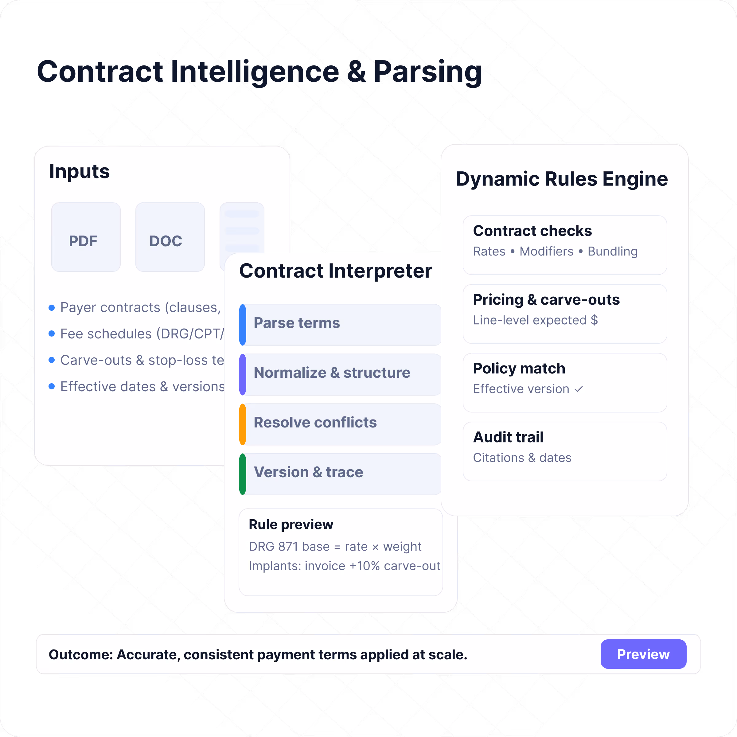 Proprietary LLM interprets complex payer contracts, fee schedules, and carve-outs, building a dynamic rules engine that reflects negotiated terms accurately and consistently.